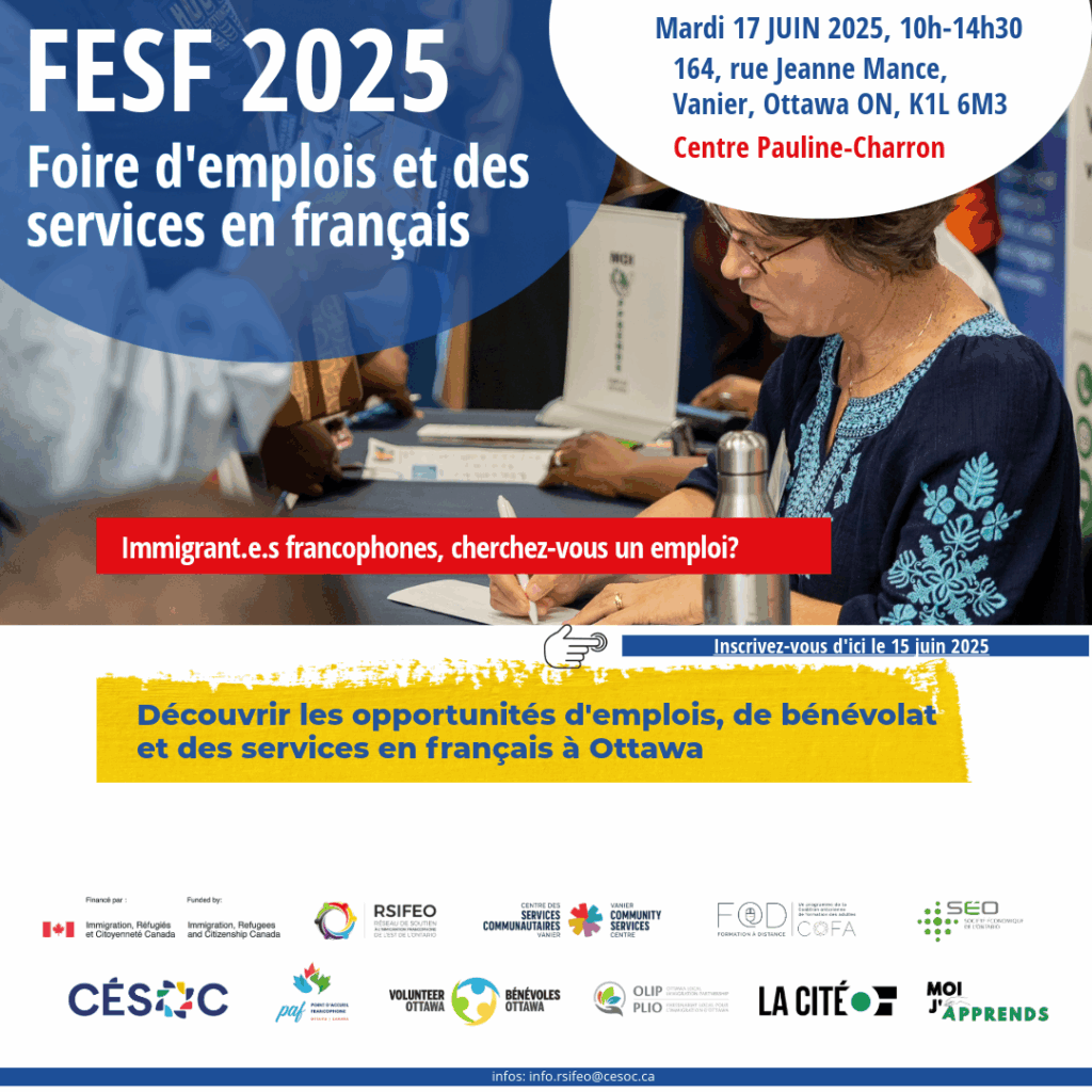 À l’occasion de la Semaine de l’accueil à Ottawa, le Réseau de soutien à l’immigration francophone de l’Est de l’Ontario (RSIFEO) organise, en partenariat avec plusieurs acteurs clés de la région, la deuxième édition de la Foire d’Emplois et de Services en français (FESF). Cet événement se tiendra le 17 juin 2025, de 10h à 14h30, au Centre Pauline-Charron, 164 rue Jeanne Mance, Ottawa, ON, K1L 6M3.