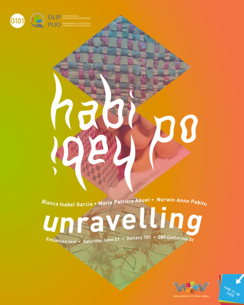 Visit Gallery 101 artist-run-centre for a tour of Unravelling: a group art exhibition by Filipina/x/o collective habi habi po. Together as a collective of immigrant and first-generation artists, habi habi po practices Philippine weaving and textile traditions of the basahan, banig, and terno by repurposing and reclaiming discarded, forgotten textiles as a means to detangle grief, to bear witness to varying embodiments of colonial violence, and finally, to ask, “how can we pass on these practices to take care of this land and each other?”
